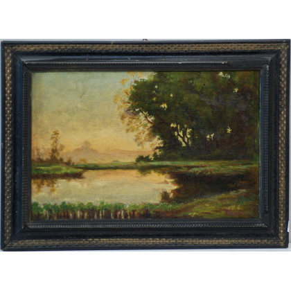 Firma indecifrata "Paesaggio lacustre" olio su compensato (cm 29x42) In cornice
