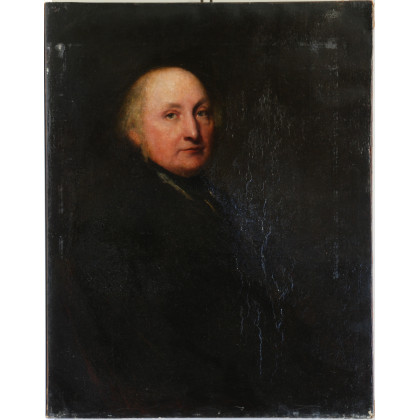 Antico dipinto ad olio su tela applicata su tavola (cm 90x70) raffigurante un ritratto di gentiluomo (difetti)