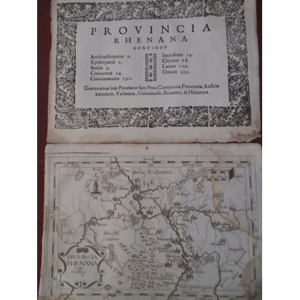 (Cartografia) Provincia Rhenana. Incisione in rame con foglio di testo allegato. Tavola proveniente dall'Atlante dei Cappuccini di Giovanni da Montecalerio. Milano, 1712. Dimensioni al foglio cm 25,5x34 circa