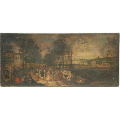Antico dipinto di scuola fiamminga raffigurante una scena di festa all'aperto (cm 46x102) (difetti)