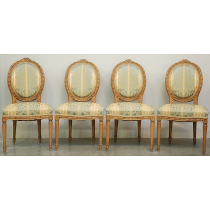 Quattro sedie "Luigi XVI" in faggio rivestite in tessuto operato