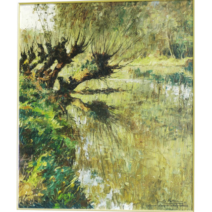 "Corso d'acqua in Val Padana" olio su compensato (cm 70x60) Firmato e titolato in basso a destra. Etichetta al retro. In cornice