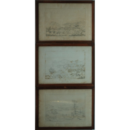 Scuola del sec. XIX, tre stampe raffiguranti paesaggi (cm 24x35). In cornice, difetti