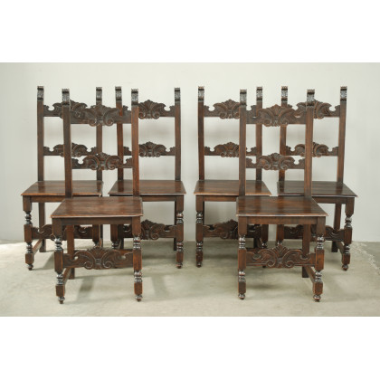 Gruppo di sei sedie rinascimentali con schienale a giorno e cartelle sagomate
