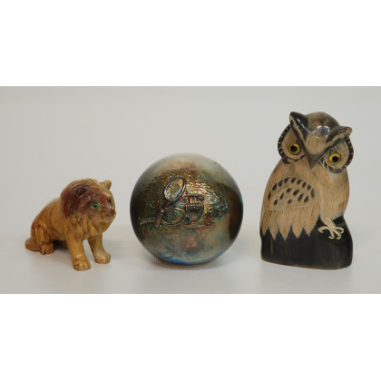 Lotto composto da due animaletti in legno e una sfera in metallo argentato, misure diverse