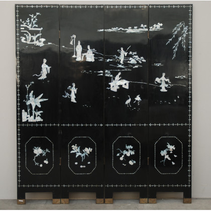 Paravento cinese a quattro ante con intarsi in madreperla frontali e dipinto sul retro in smalto policromo a motivi floreali (difetti)(cm 180x160)