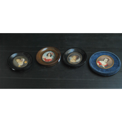 Gruppo di quattro miniature di diversa misura raffiguranti gentildonne. In cornici (difetti)