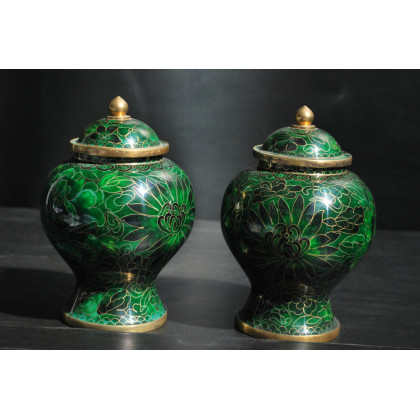 Manifattura di Cina. Coppia di piccole potiche con coperchio in metallo cloisonnè a fondo verde (h cm 15)