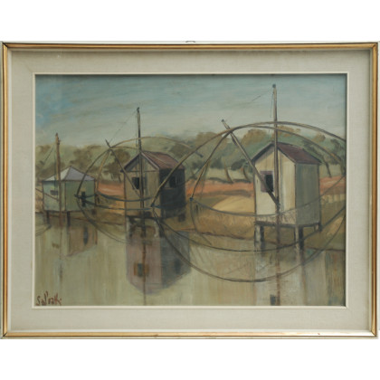 "Paesaggio con palafitte di pescatori" olio su masonite (cm 57x78) firmato in basso a sinistra, in cornice