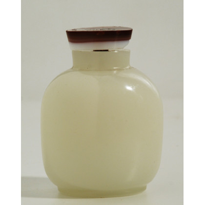 Snuff bottle di forma bombata in vetro. Tappo in agata. Cina, sec. XX. (h cm 7) (difetti)