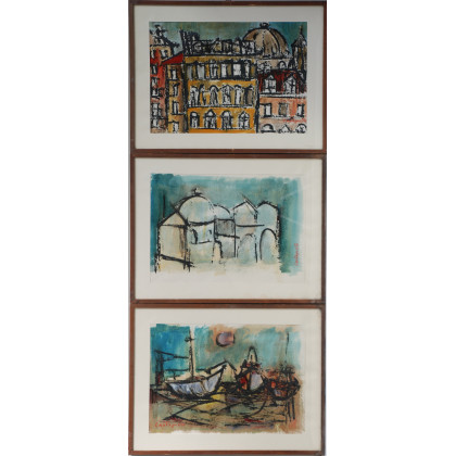 Lotto di tre tecniche miste a soggetti e misure diverse, in cornici