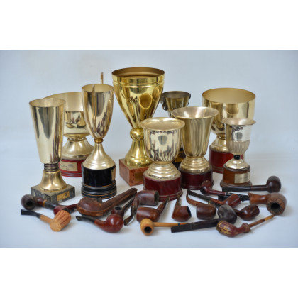 Cartone contenente numerose coppe di diverse fogge e materiali e numerose pipe (difetti)