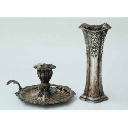 Lotto composto da un vasetto ed una bugia in argento decorati in rilievo (gr 200 ca) (difetti)
