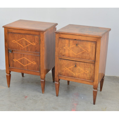 Coppia di comodini in noce uno a due cassetti e uno a due finti cassetti. (cm 51x77x42) Fine del XVIII secolo
