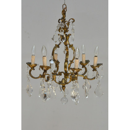 Lampadario in metallo dorato e pendenti a sei luci decorato da gocce in cristallo