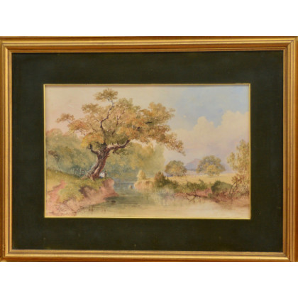 Firma indecifrata "Paesaggio fluviale con pescatori", acquarello su carta (cm 40x57)Firmato in basso a sinistra In cornice
