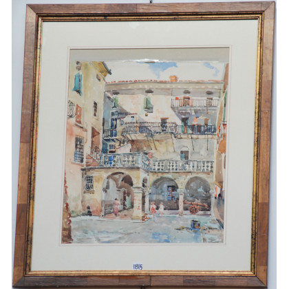 Maestro lombardo degli inizi del XX secolo, "Veduta di casa di ringhiera", acquarello su carta (cm 49x39)