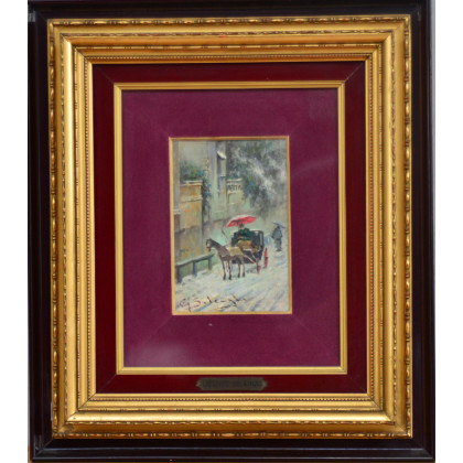 Anonimo "Carrozza sotto la neve lungo il Naviglio", olio su cartone (cm 15x10)