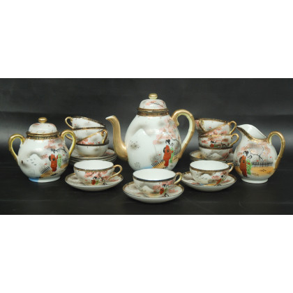 Manifattura giapponese, Servizio da the in porcellana composto da teiera, lattiera, zuccheriera, dodici tazze e undici piattini in porcellana a pelle d'uovo decorata da figure in un giardino (difetti)