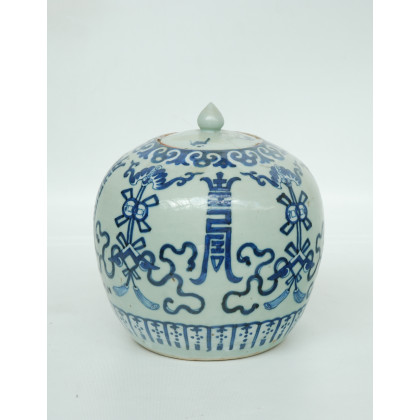 Potiche in porcellana azzurra decorata con fregi blu 6/6 sferico. Cina, inizio del secolo XX