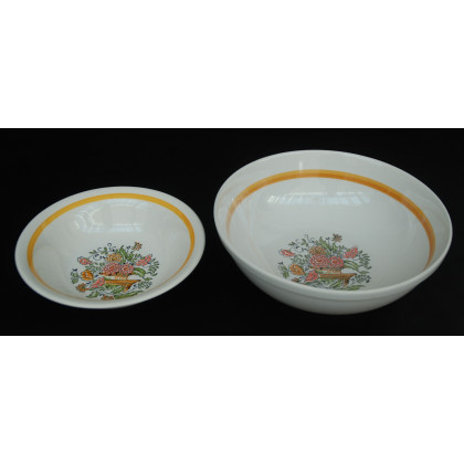 Due zuppiere in ceramica con fiori policromi e riga gialla