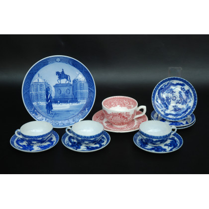 Lotto composto da un piatto in porcellana Copenhagen, una tazza con piattino Wedgwood con decoro rosso e tre tazze con sei piattini in porcellana bianca e blu, Cina (difetti)