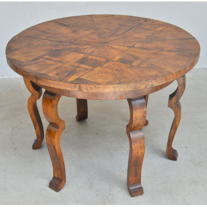 Tavolo lastronato in radica, piano circolare e gambe a sei gambe, a doppia mossa, anni '30 (d cm 96 h cm 67)