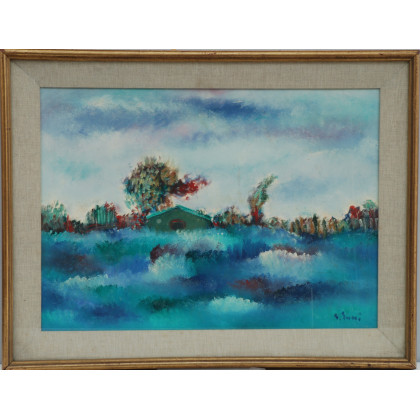 Firma indecifrata "Paesaggio con casolare" Olio su tela (cm 50x70) firmato in basso a destra. In cornice