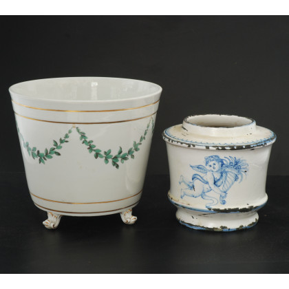 Manifatture diverse del sec XIX Lotto composto da un cache pot in porcellana decorato a tralci di foglie. Base a quattro piedini a ricciolo e un vaso decorato con putto portafortuna decorato in blu (difetti)
