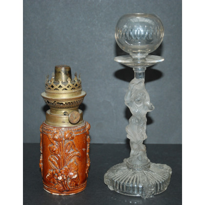 Lotto composto da un candeliere in vetro e una lampada ad olio con base in ceramica (difetti)