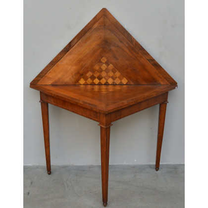 Tavolino da gioco di forma triangolare, piano filettato e scacchiera interna, gambe troncopiramidali (cm 110x73x55)