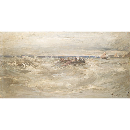 Ignoto del sec XIX. "Pescatori" 1914, olio su cartone pressato (cm 22x41) Firma "P. Mariani "e data 1914 apocrifa in basso a destra. In cornice