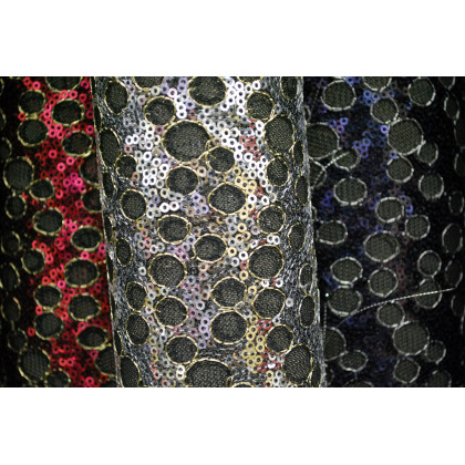 Lotto di n. 3 pezze di tulle nero a pois irregolari di rete e paiettes su rinforzo in rete platino nei colori blu (mt 5), rosso (mt 4,8) e argento (mt 0,80); h 110. Composizione: Pa Ps