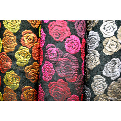 Lotto di n. 3 pezze di tessuto in lana e lurex con grandi rose nei colori nero/rosso/fucsia (mt 9,9) nero/arancio/giallo (mt 9,5) e nero/bronzo/lilla (mt 8,5) doppiati in tela nera; h 150. Composizione: Pa Pc Ps Wo