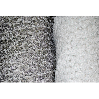 Lotto di n. 2 pezze di tulle con pavé di roselline a rilievo spolverate in glitter e doppiate in rete nei colori bianco (mt 5) e bianco/argento (mt 5); h 110. Composizione: Pa Ps