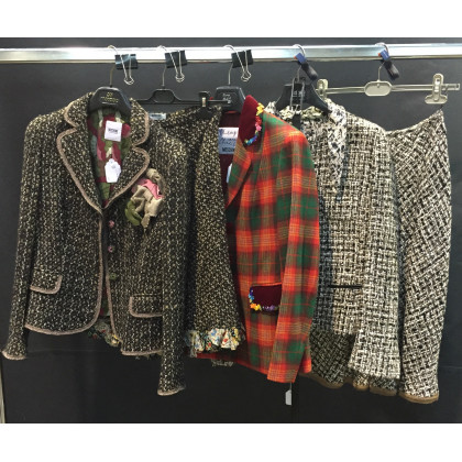 Prada e Moschino: lotto composto da due tailleur giacca con gonna in lana bouclé tonalità marrone, nero e beige e da una giacca in lana scozzese color verde e rosso, tg 42 (lievi difetti)