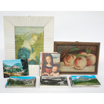 Lotto composto da un piccolo dipinto ad olio raffigurante pesche, una riproduzione in cornice ed alcune cartoline