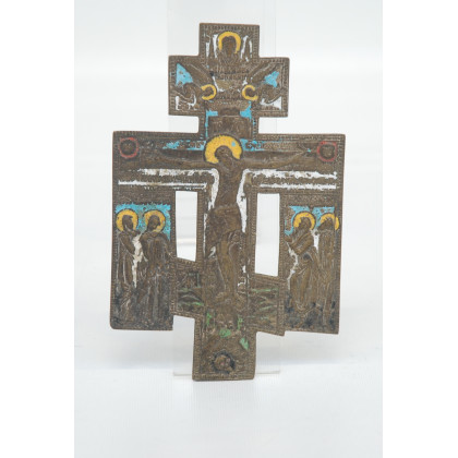 Crocefisso in bronzo cesellato a figure di santi e angeli sui lati. Tracce di smalti policromi (cm 17x11) Fine del secolo XIX