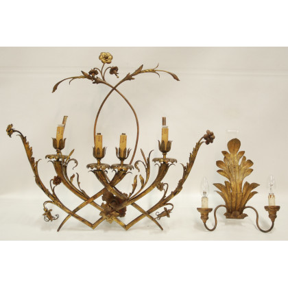 Applique a quattro luci in metallo dorato, bracci a cornucopia con foglie e fiori, montata a luce elettrica (h cm 65) e una applique più piccola a due luci composta da grande foglia e bracci ricurvi (h cm 33)(difetti)