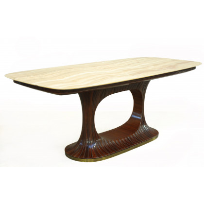 Tavolo da pranzo con grande sostegno in legno a due montanti, fascia scanalata e piano in onice ad angoli stondati. Esecuzione italiana anni 50 sec XX (cm 92x80x220) (difetti)