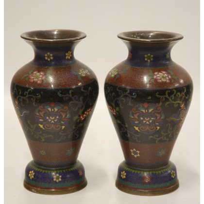 Manifattura cinese inizio del sec. XX coppia di vasi in metallo cloisonne decorati in policromia (cm 21)