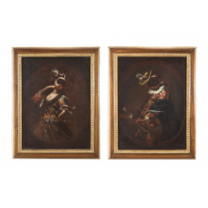 Scuola veneta del sec. XVIII "Maschere" coppia di dipinti ad olio su tela (cm.38x28) In cornici Venetian school of the 18th century. "Maschere" pair of oils on canvas