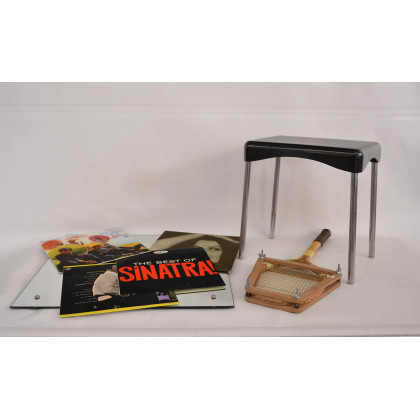 Lotto composto da una racchetta da tennis, anni '60 uno sgabello in plastica nera, uno specchio (cm 57x60) e quattro vinili (difetti)