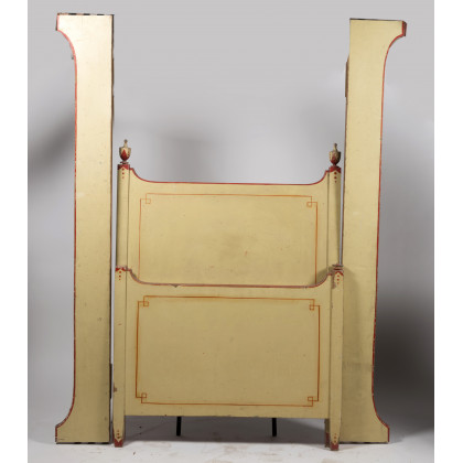 Letto in legno laccato decorato nei toni del rosso a motivi di gusto 900.Italia anni 20/30 (difetti e mancanze)