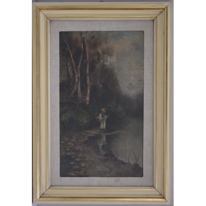 "Il pescatore lacustri" olio su tavoletta firmato in basso a destra (cm 47x27) In cornice (difetti)