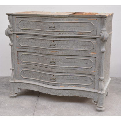 Comò in legno laccato di forma mossa con montanti scolpiti. Sec XIX (mancante del piano)
