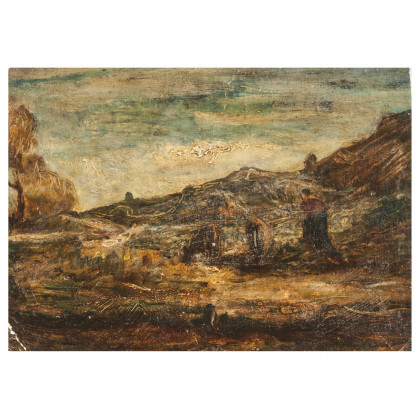 Ignoto "Scorcio di montagna con pastorella e mucche" olio su carta applicata su tela (cm 18x25.5) (Difetti)