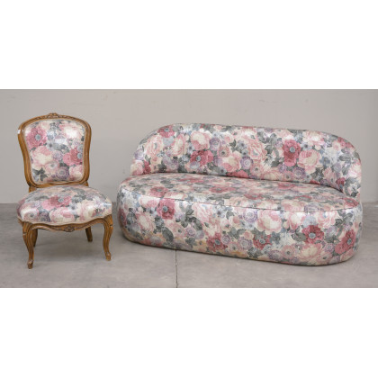 Lotto composto da un divanetto ed una sedia da balia ricoperti in tessuto a fiori
