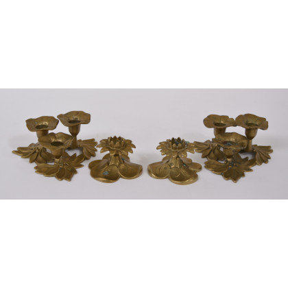 Lotto composto da quattro candelieri in ottone con basi a fiori e foglie