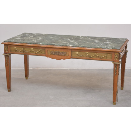 Tavolo da salotto con piano in marmo verde con base in legno decorata da fregi in bronzo dorato (cm 128x58x56)